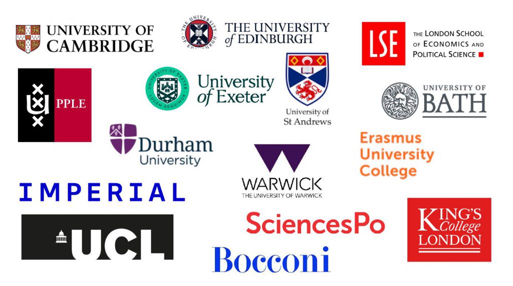 Les universités présentes : University of Cambridge, Imperial College London, London School of Economics and Political Science (LSE), King's College London (KCL), University College London (UCL), University of Edinburgh, University of Warwick, Durham University, University of Bath, University of Exeter, University of St Andrews, Bocconi University, Erasmus University of Rotterdam (EUC), University of Amsterdam (UvA PPLE), Sciences Po.